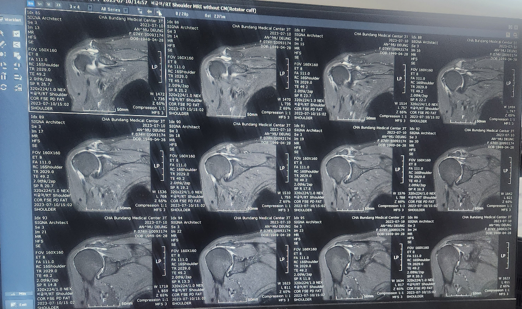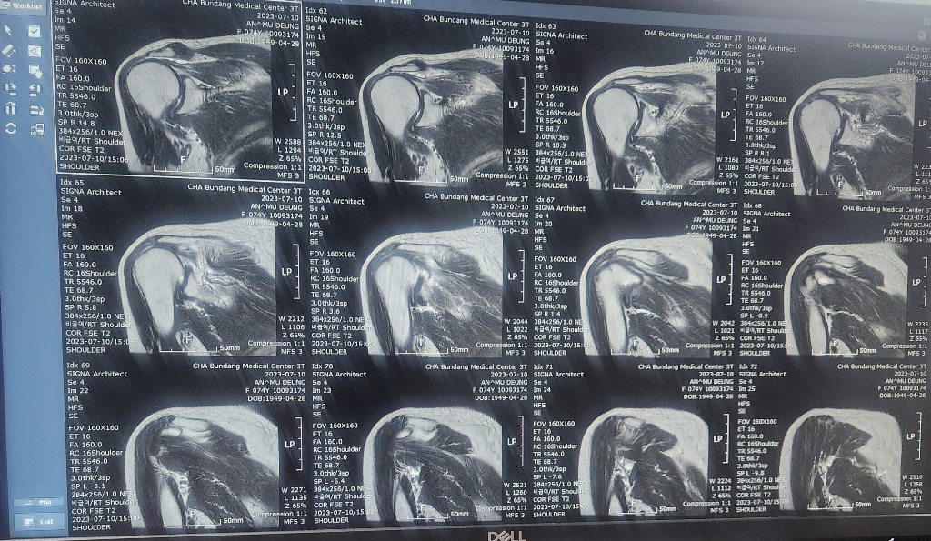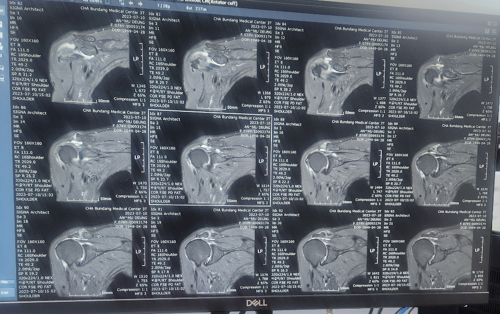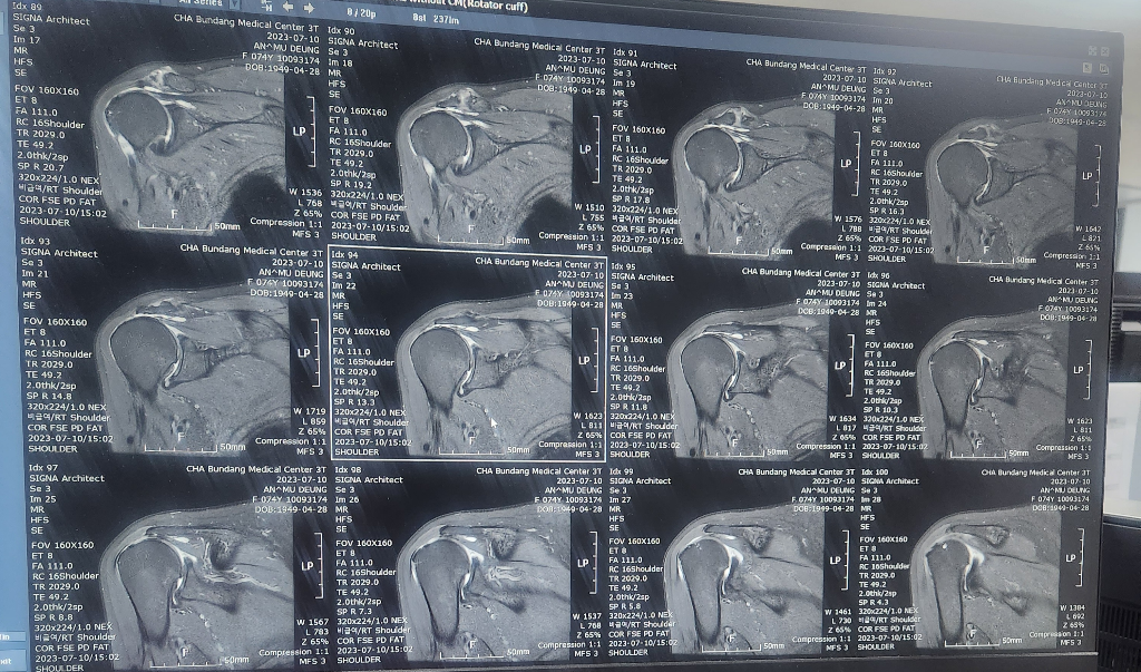 현재 어깨관절에 물이 차있는 소견으로 염증이 있는 것으로 보이며, 회전근개의 경우는 영상의 크기가 작아 정확한 판단은 어렵겠습니다.