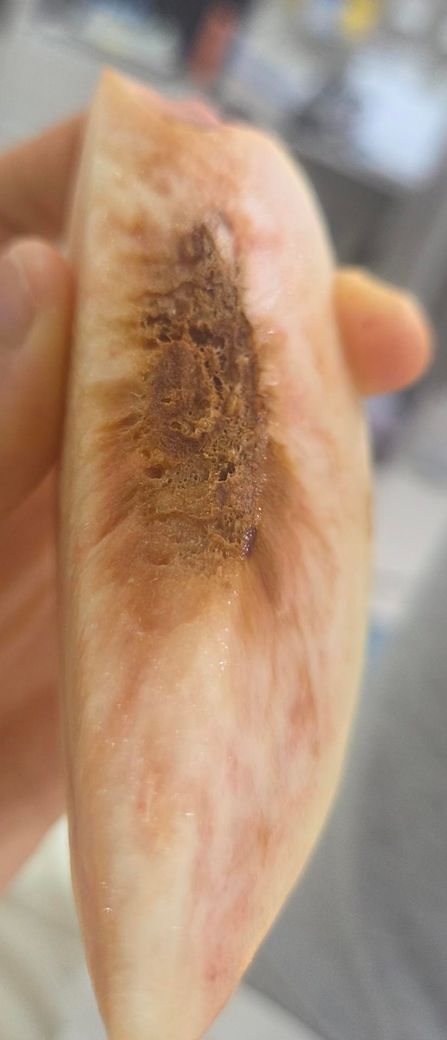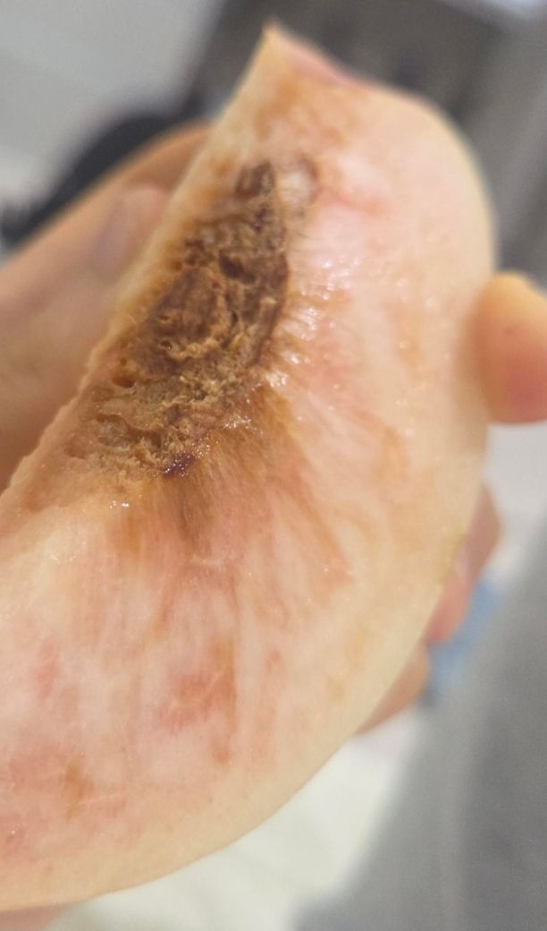복숭아를 한창 먹다 보니 면적 넓은 갈색 무언가가 있는데, 상한건지 곰팡이라도 핀건지.... 왜 저런 건가요?