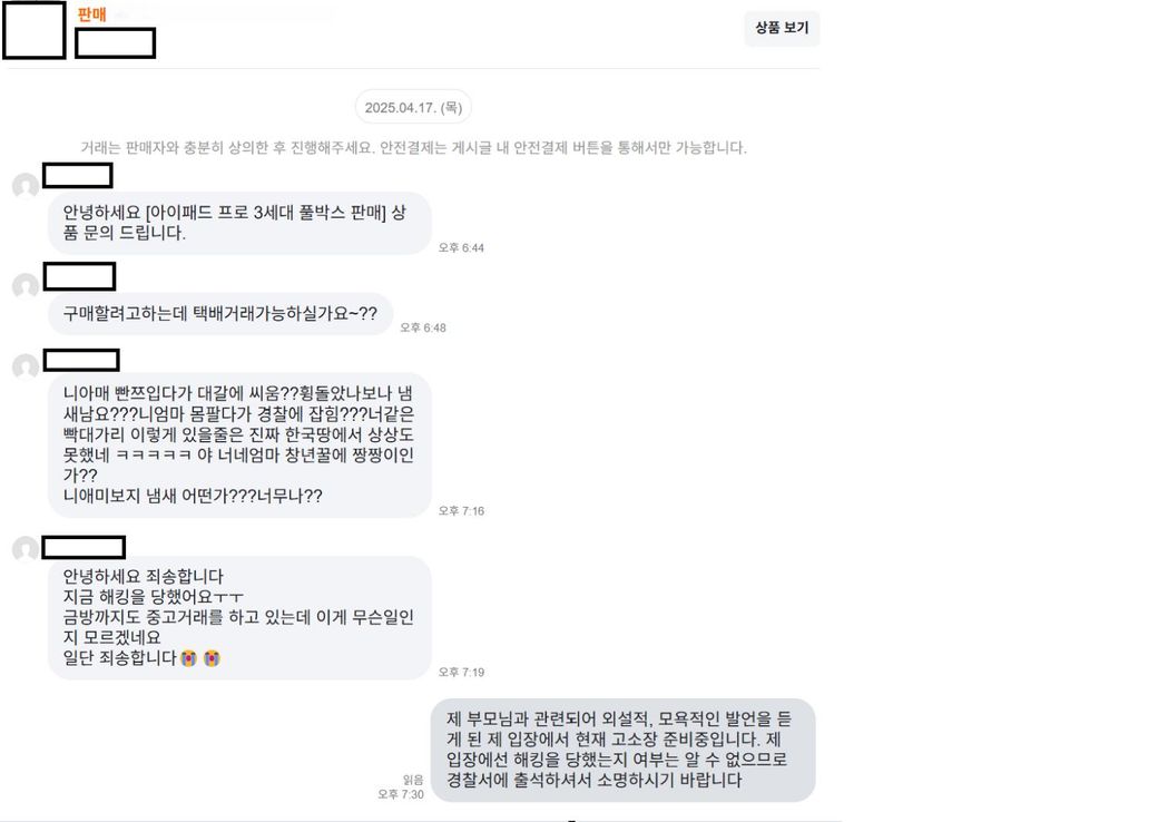 채팅 내용 보시면 본인의 아이디가 해킹당했다고 하며 본인이 한게 아니라고 하는데