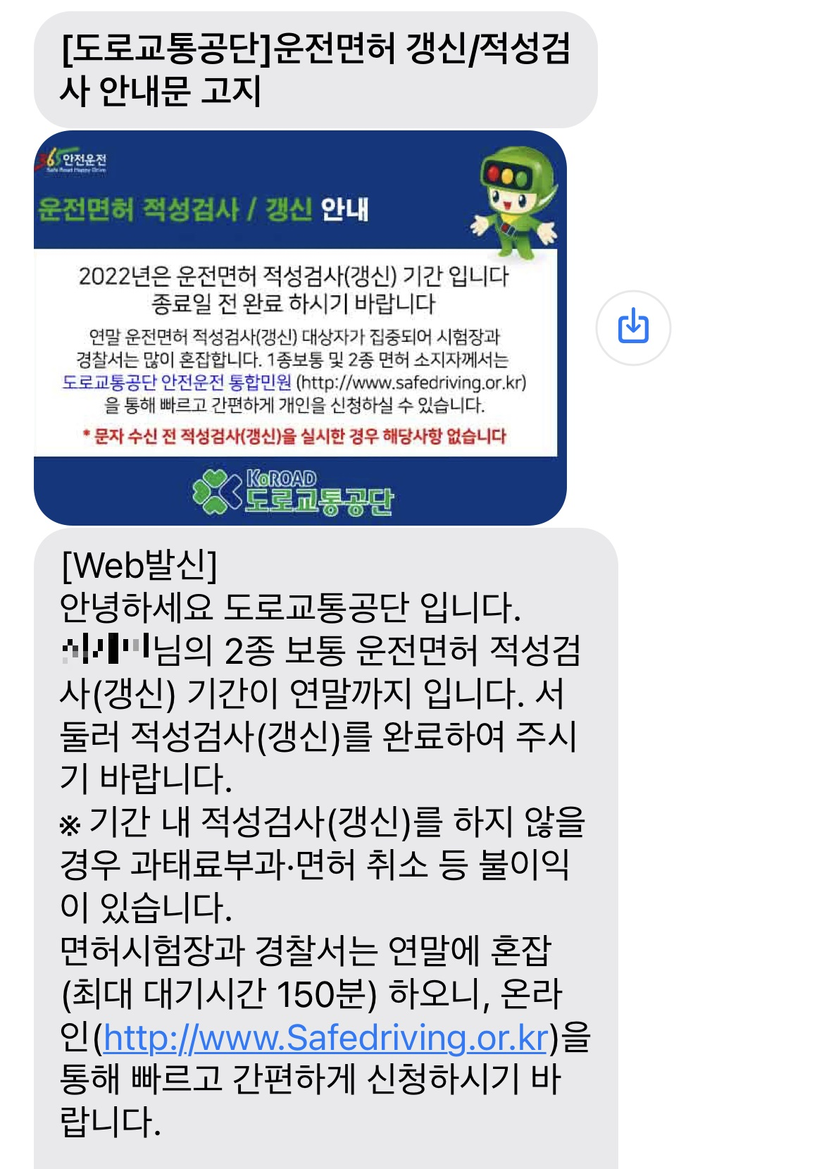 도로교통공사로 부터 갱신 기간에 임박하는 경우 유선으로 문자 연락이 가게 됩니다. 아래와 같이 문자가 오게 됩니다.