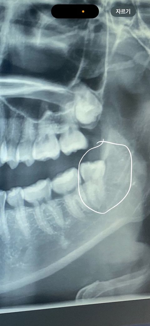 동그라미 친부분이 현재 아래쪽 사진 동그라미 친부분이 맞는걸까요? 부분매복사랑니인가여