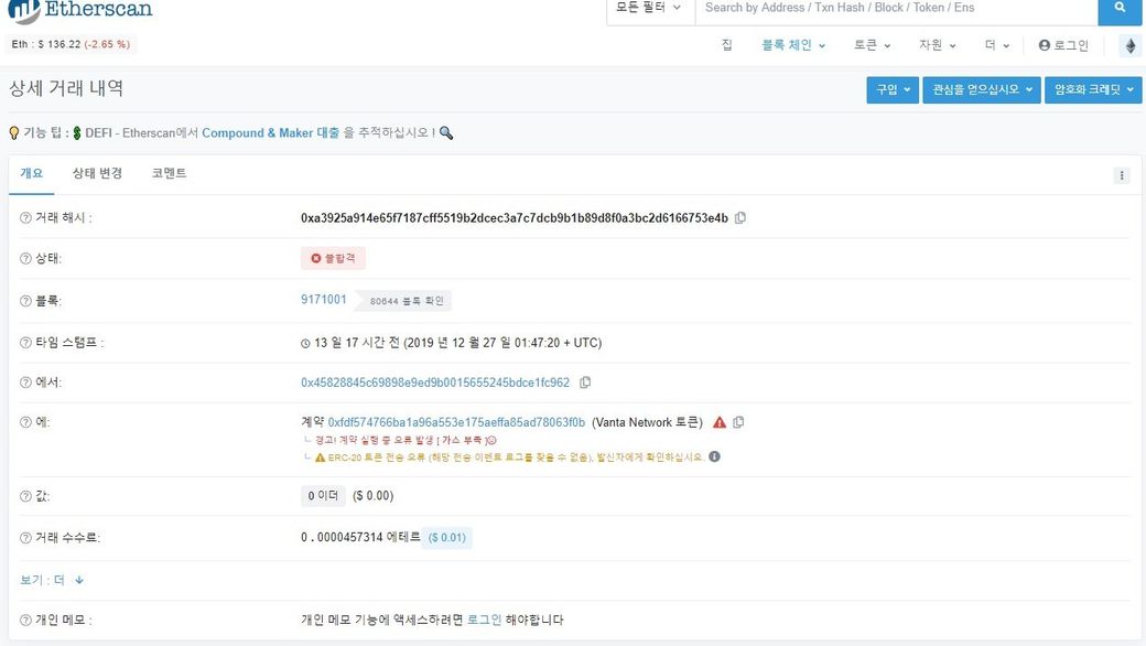 잔액이 실제로 공제 되더라도 토큰 계약은 전송 이벤트를 생성하지 않습니다 (완전히 ERC-20 준수는 아님). 특정 토큰의 토큰 계약은 유효한 전송 이벤트 로그를 제공하지 않으므로 트랜잭션이 실패합니다. 이 문제는 ERC-20 토큰에 대한 준수 정책으로 인해 발생합니다.