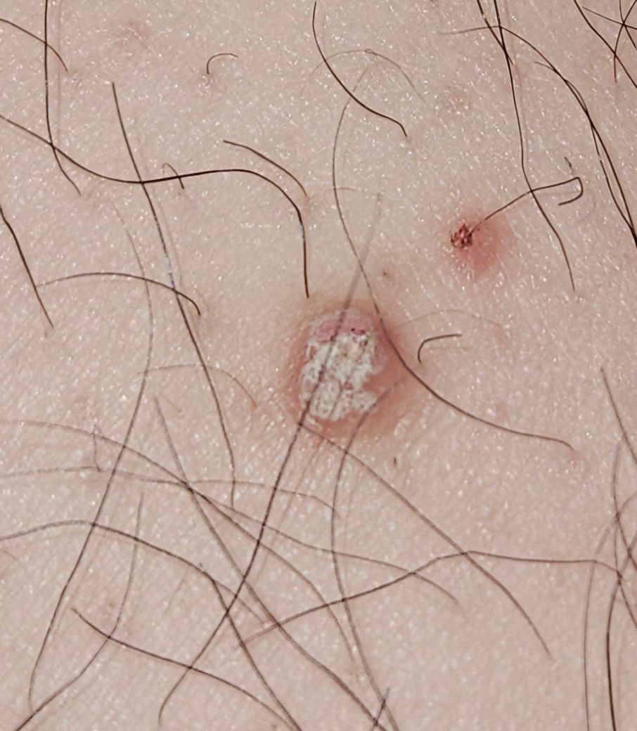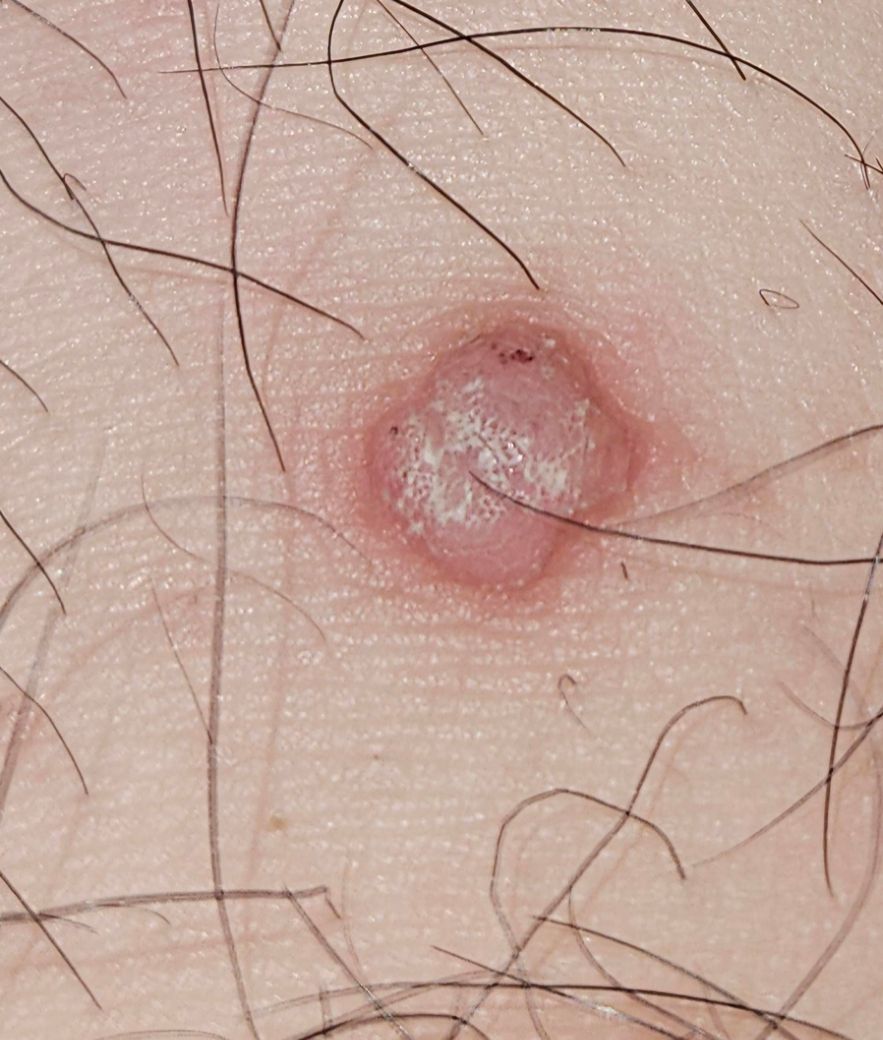 우선 질문자님의 사진상의 병변으로만 놓고 보았을 때는 티눈일 가능성이 높아보입니다. 중심부에 하얗게 모여있는 각질의 핵이 관찰되는 것으로 생각되며, 지속적인 마찰 (손으로 잡아 뜯는 경우)나 압박이 생기면 점차 커질 수 있으므로 주의를 요합니다.