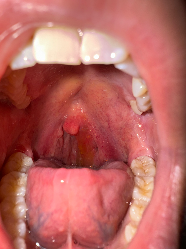 사진에 관찰되는 모습으로는 편도염보다 인두염이 문제가 되는 상황입니다. 편도는 정상적이고 염증이 없는 모습인 반면 인두에는 염증이 심합니다. 이비인후과를 방문해보시면 되겠습니다.