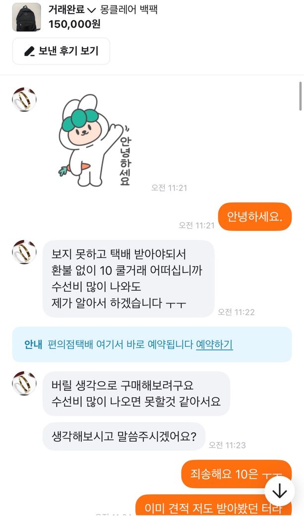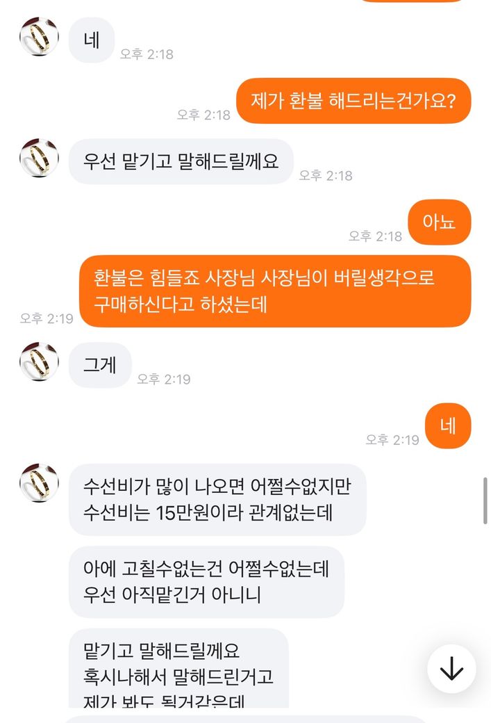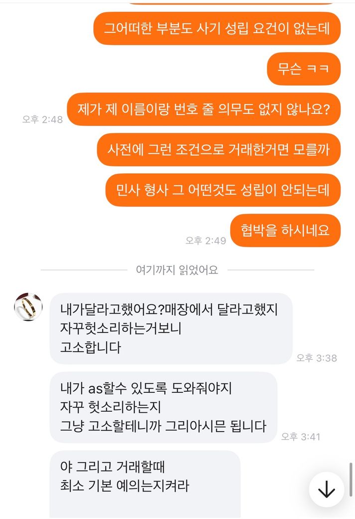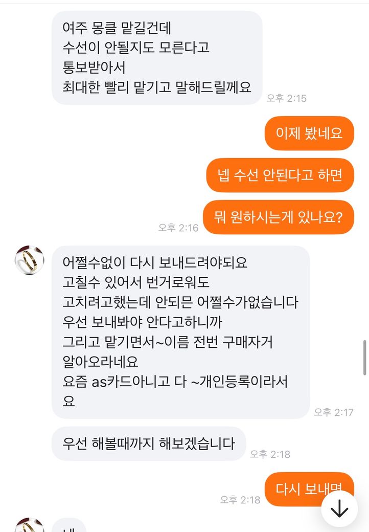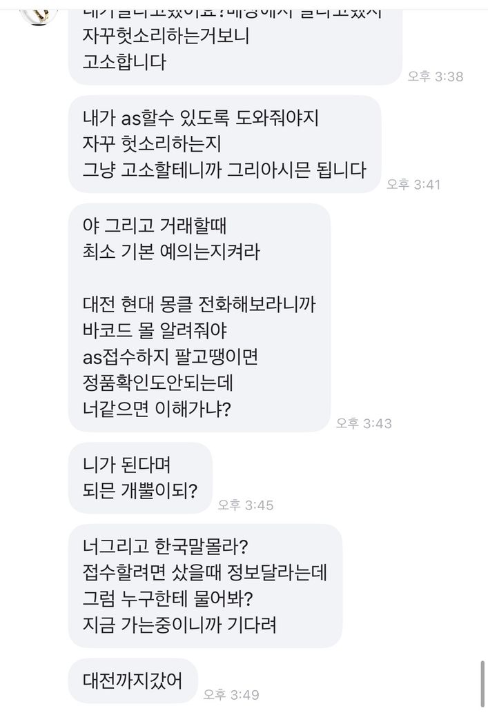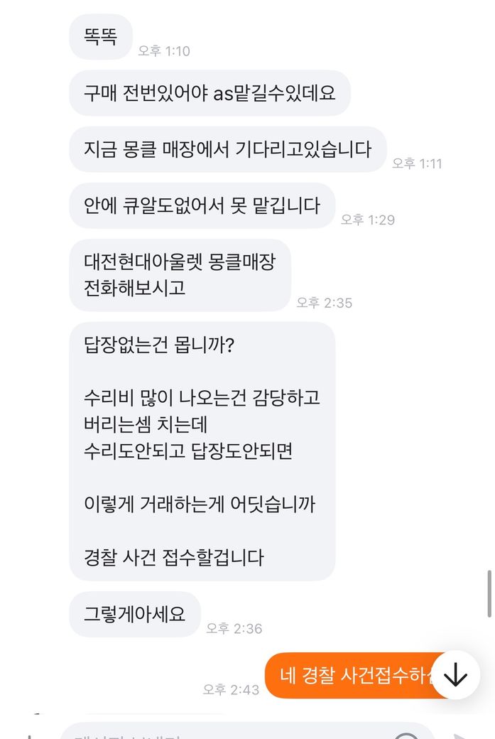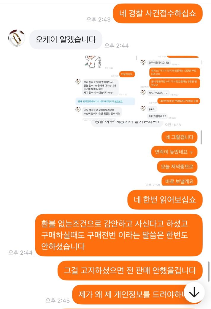 이 제목 그대로 저 가방을 15에 올렸고 구매자분이 그냥 버릴생각으로 환불조건없이 살테니까 10에달라하였습니다 그래서 제가 그건 힘들다 만원정도 깎아주겠다 하니까 알겠다고 하고 구매하였고 택배가 구매자한테 도착하니까 몽클레어 매장에서 수선이 불가능하면 환불을 해달라고 연락이왔습니다 그래서 저는 그건 불가능하다 사시기전에 하자도 인지하셨고 본인이 버릴생각으로 환불없이 산다고 네고해달라 하지않았냐 하였더니 알겠다 하였습니다 근데 오늘 연락와서 몽클레어 매장에 맡기려니까 구매당시 구매자 전화번호 이름 알려달라 했다길래 사전에 그런 고지는 안하시지 않았냐 개인정보라 못드린다니까 형사접수 한다고하고 저렇게 반말하고 협박을 합니다 이게 제가 법적으로 문제될게 하나라도 있으면 말해주세요 전문가님들 판매전부터 지금까지 했던 모든 대화내용 사진 첨부했습니다
