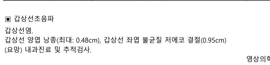 30대 초반 여자이고 국가검진하면서 갑상선 진료를 추가로 받았어요 피검사는 정상인데 초음파에서 갑상선염, 갑상선 양엽 낭종, 갑상선 좌엽 불균질 저에코 결절로 내과진료 및 추적검사를 하라고 소견이 나왔는데 사진속 수치가 많이 심각한 상황일까요? 아무 생각없이 받은 검사인데 결과가 이래서 많이 걱정되고 초조합니다 ㅠㅠ 저 결과가 암이라는 말인가요? 아님 암으로 될 가능성이 높나요?