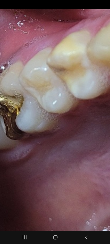 저사진만 봐서는 충치일지 아니면 기존 떼운 것에 때가 끼거나 변색인지 구분이 쉽지 않습니다. 이차충치가 의심된다면 방사선사진도 추가적으로 찍어봐야합니다.