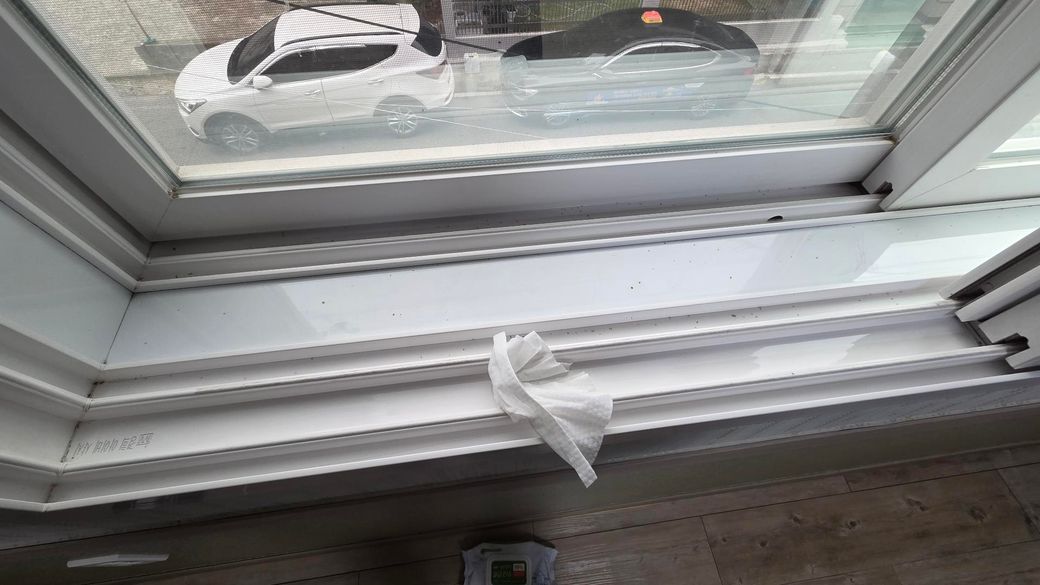 일단 샷이의 물 배수 구멍을 휴지로 물을 뭍혀서 막으신 다음 창문을 닫았을때 빈틈이 벌어지는 지 확인 후 문 아래 롤러 높이를 조절 해줄 필요가 있습니다. 그리고 창문과 창문이 맞다는 부분의 모헤어(털)을 두터운 것으로 교체하면 문이 좀 뻑뻑하기는 해도 확실히 벌레가 잘 들어오지 못합니다.
