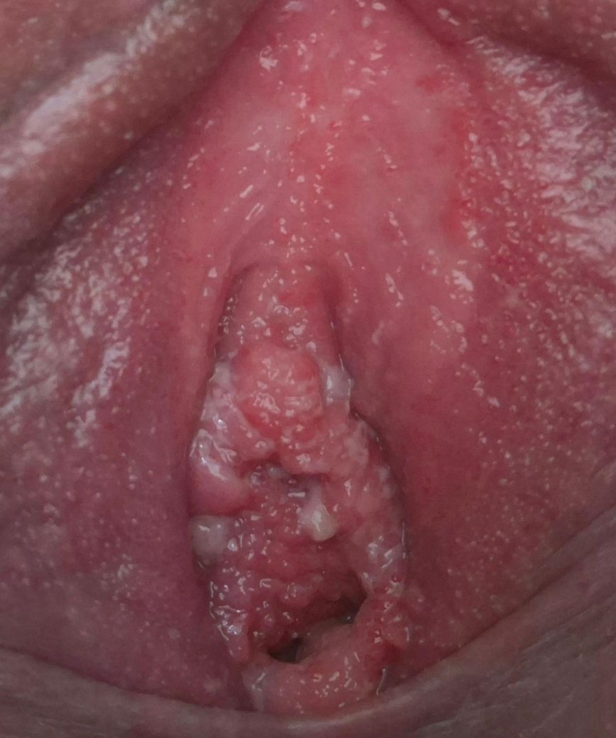 현재 상황에서 중요한 점은 항생제 사용 후 심한 가려움이 먼저 시작되었고 질에서 외음부 전체로 가려움이 퍼졌다는 점입니다. 이는 임상적으로 칸디다 질염에서 매우 흔한 양상입니다. 또한 칸디다는 외음부 점막이 붉어지고 부어 울퉁불퉁하게 보일 수 있으며 긁은 부위가 미세 미란처럼 보일 수도 있습니다. 사진에서 보이는 하얀 덩어리 모양은 칸디다 분비물 가능성을 완전히 배제하기는 어렵습니다. 다만 사진 한 장만으로는 분비물인지 염증성 삼출물인지 구분이 제한됩니다.