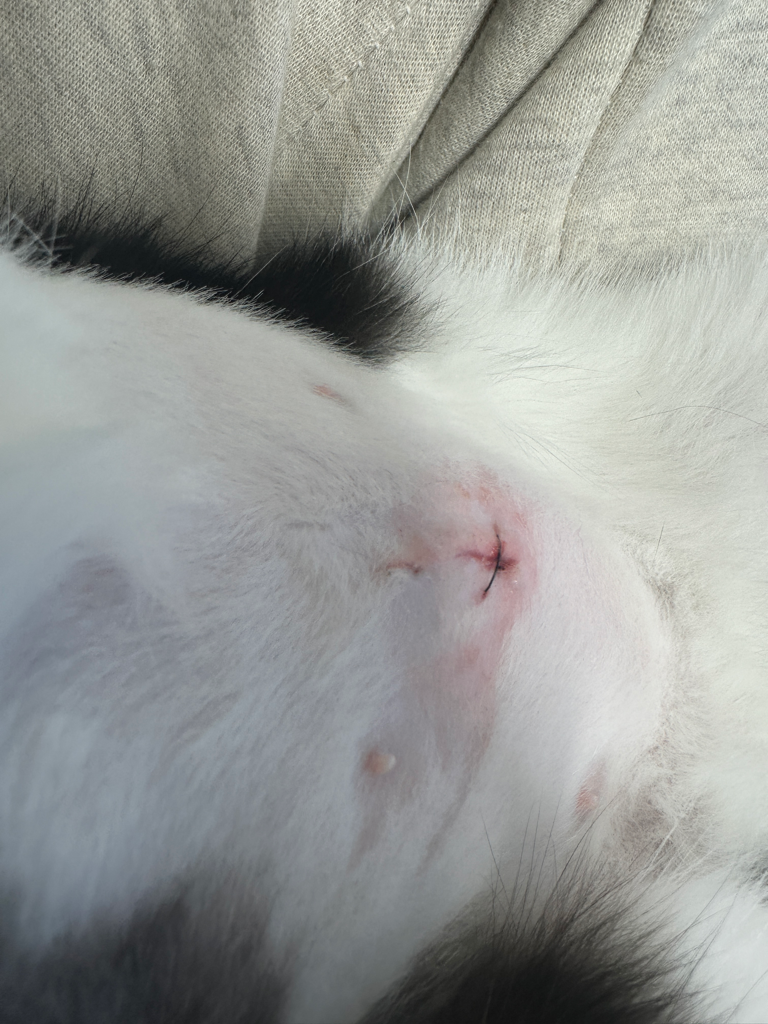 주변에 발적이 있는 상태이고 내부에서 튀어나온 실밥이라면 이 실밥이 침이 들어가는 통로로 작용하기 때문에 좋지 않습니다. 수술해준 주치의와 협의하에 제거할지, 약을 먹일지 결정하시기 바랍니다.