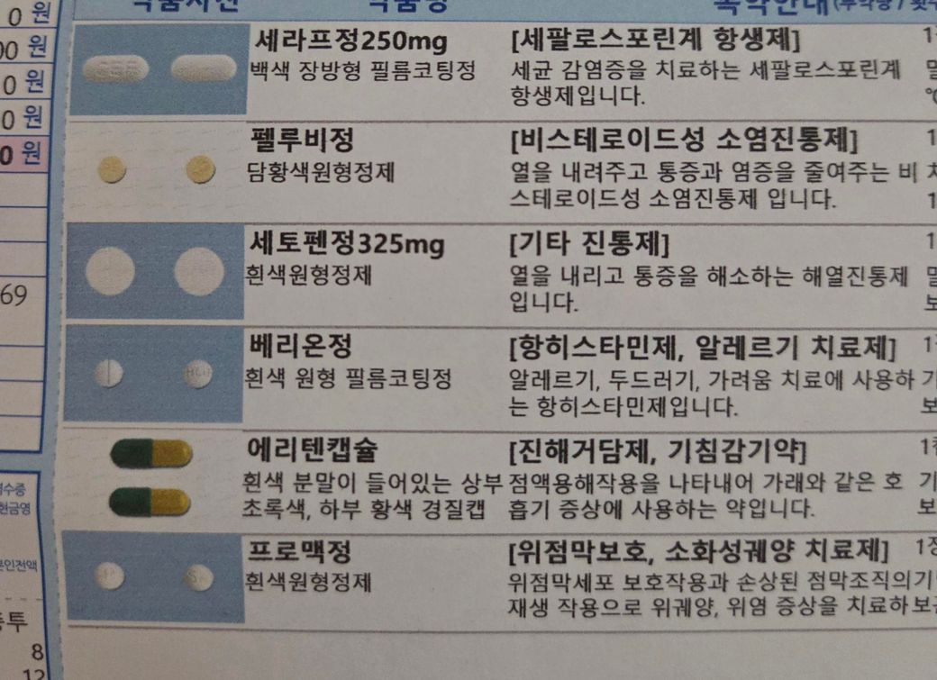감기 때문에 최근에 처방받아 먹고 있는 약들인데 꽃가루철이라 또 알레르기성 비염이 같이 걸린 것 같거든요