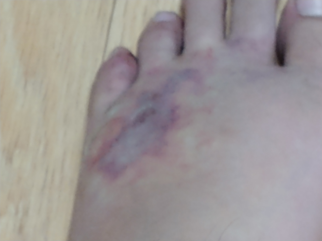 멍 자체가 괴사하는 경우는 없으며 현재 발등의 상태는 타박상에 의한 혈종의 상태로 보입니다.