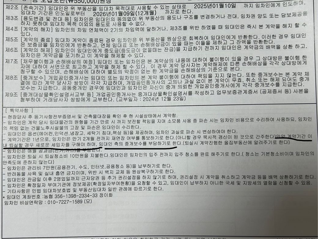 이렇게 적혀있습니다 제가 군대에 가게되어 중도 퇴거를 해야될꺼 같다 말씀드리니 미리 말한게 아니기에 지인 구하는거 아니면 부동산 통해서 새입자 구하는건 자긴 용납 못 한다고 하는데 특약사항에 이렇게 되어있어도 안 되는건가요? 부동산에서 새입자 못 구하면 안 나갈꺼긴합니다 그것도 고지해드렸는데 그냥 부동산 끼는거 용납 못한다네요 뭐라고 말씀 드려야할까요 그리고 쩌기 특약사항에 퇴거시 부동산에 말해줘야한다는데요 저걸 빌미로 말해야할까요2개의 답변이 있어요!