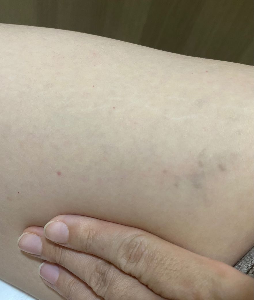 어제는 없었는데 오늘 허벅지에 검은색으로 반점(사진에서 우측 가운데) 같은게 생겼는데 저게 무엇인가요? 베체트로 이뮤란정 반알씩 4일먹으니 저런게 생겼는데 연관있나요?