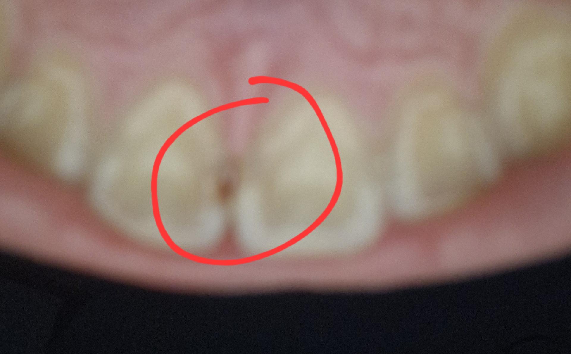 사진으로 봤을 경우에는 치아의 인접면에 충치가 생긴것으로 보입니다. 인접면에 충치가 있다면 치료를 해주는것이 좋으며 레진이나 크라운 보철치료가 필요할수 있습니다.