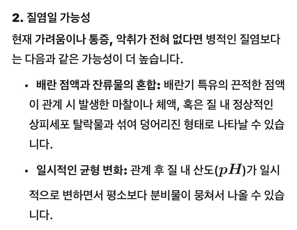 오늘 관계하고 (당연히 콘돔착용 했습니다!) 30분 뒤에 갑자기 노란색 덩어리가 쏟아졌어요… 냄새가 나거나 질가려움이 있지는 않은데 혹시 이거 질염인가요…? 아까 이후로 더이상 덩어리는 떨어지지 않고 소변보고 닦을때도 하얀 점액만 닦이더라구요! 내일 당장 산부인과 가볼건데 제미나이는 이럴 수 있다고해사.. 혹시 저랑 같은 증상 있었던분 계실까용 ㅠㅠ