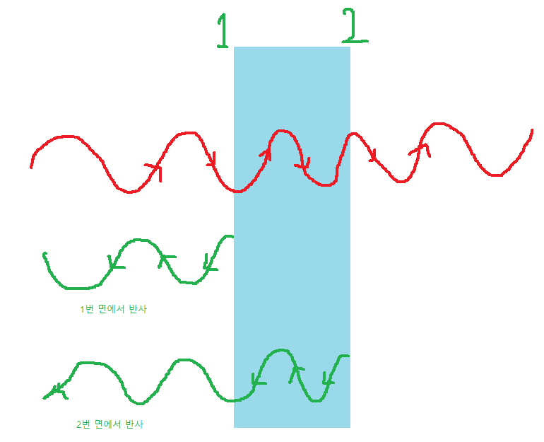 아래 그림에서는 1번면, 2번면에서 각각 반사가 일어나 빛이 간섭하는데, 서로 위상이 반대라 상쇄간섭이 일어나 반사율이 최소입니다. 유리의 간격이 늘어나면 2번에서 반사되는 빛의 위상이 1번의 위상과 같아질 때가 있는데, 이 때에는 최대의 반사율이 되는 것이죠.