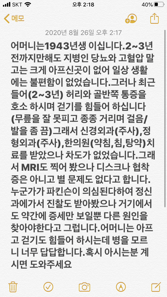 어머니는1943년생 이십니다.2~3년 전까지만해도 지병인 당뇨와 고혈압 말고는 크게 아프신곳이 없어 일상 생활에는 불편함이 없었습니다.그러나 최근들어(2~3년) 허리와 골반쪽 통증을 호소 하시며 걷기를 힘들어 하십니다(무릎을 잘 못피고 종종 거리며 걸음/발을 좀 끔)그래서 신경외과(주사),정형외과(주사),한의원(약침,침,탕약)치료를 받았으나 차도가 없었습니다.그래서 MRI도 찍어 봤으나 디스크나 협착증은 아니고 별 문제도 없다고 합니다.누군가가 파킨슨이 의심된다하여 정신과에가서 진찰도 받아봤으나 거기에서도 약간에 증세만 보일뿐 다른 원인을 찾아야한다고 그럽니다.어머니는 아프고 걷기도 힘들어 하시는데 병을 모르니 너무답답합니다.혹시 아시는분 계시면 도와주세요