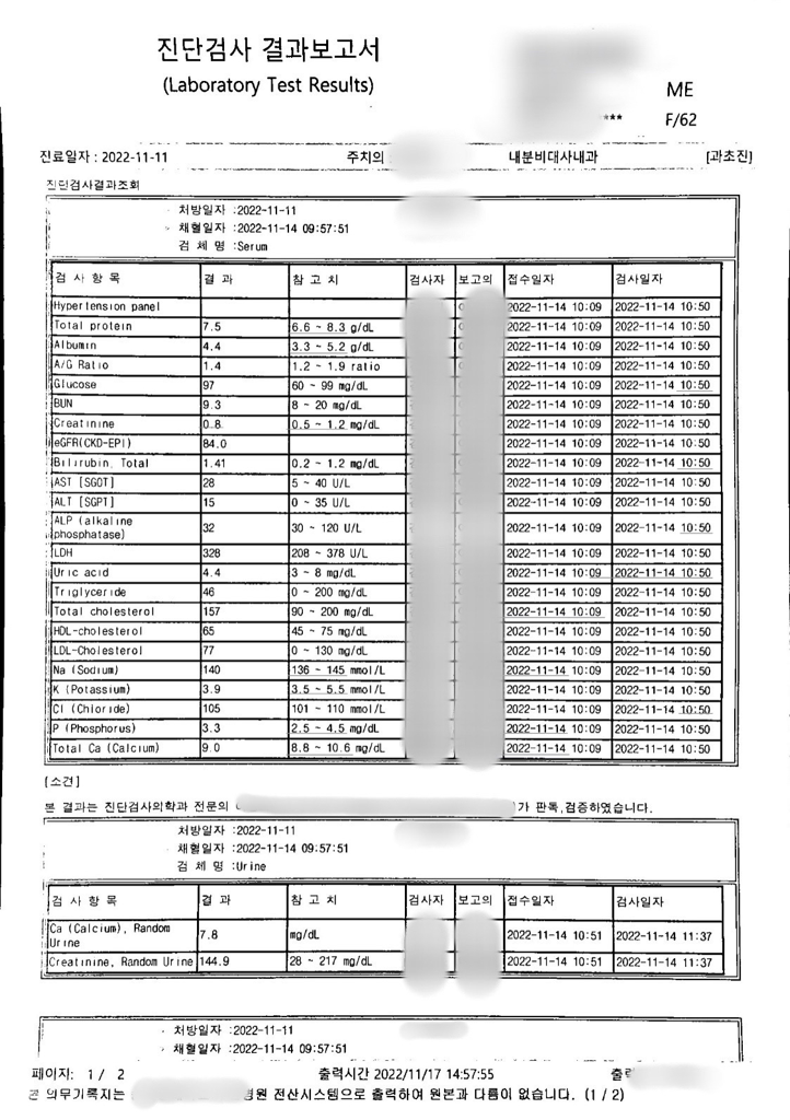 현재 빌리루빈 수치가 경하게 상승되어 있고 콜레스테롤은 정상으로 보입니다. 하지만 부갑상선 호르몬이 상승해 있고 비타민D 역시 경하게 부족한 정도를 보입니다. 해당 의료기관에 내원하시어 진료를 받아보시는 것이 좋겠습니다.