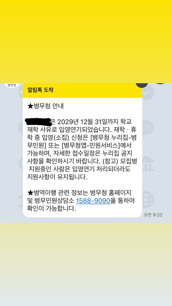 대학교 다니는 중에 해병대 지원했습니다 7월 입영 모집병으로 1차 합격 했는데 병무청에서 이런 카톡 왔습니다
