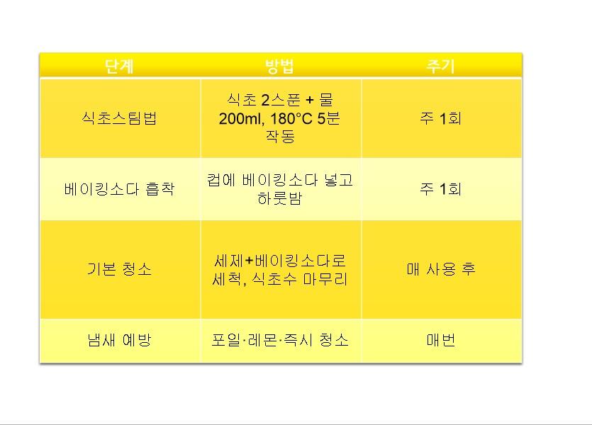 에어프라이어 음식냄새 제거 방법을 표로 만들어봤습니다. 참고하셔서 깨끗한 에어프라이어 관리하시길~