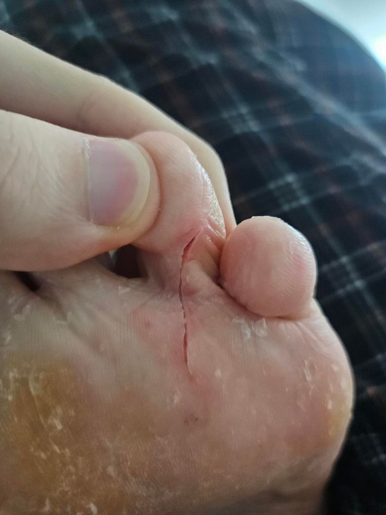 사진상으로는 표면 열상처럼 보이지만, 발가락 사이에서 발바닥 쪽으로 길게 벌어져 있고 위치상 장력이 많이 걸리는 부위라 단순 겉모습만으로 봉합 필요성을 배제하기는 어렵습니다. 특히 바닷물에 노출된 상처는 겉이 붙어 보여도 내부가 열려 있으면 감염 위험이 상대적으로 높습니다. 실제로 벌려서 깊이 확인했을 때 진피 아래까지 도달하거나 보행 시 다시 벌어진다면 봉합 또는 의료용 접착, 경우에 따라 예방적 항생제 처치가 필요할 수 있습니다. 개인 판단으로 버티기보다는 오늘이나 늦어도 내일 외과나 응급실에서 직접 확인받는 쪽이 보수적으로 안전합니다.