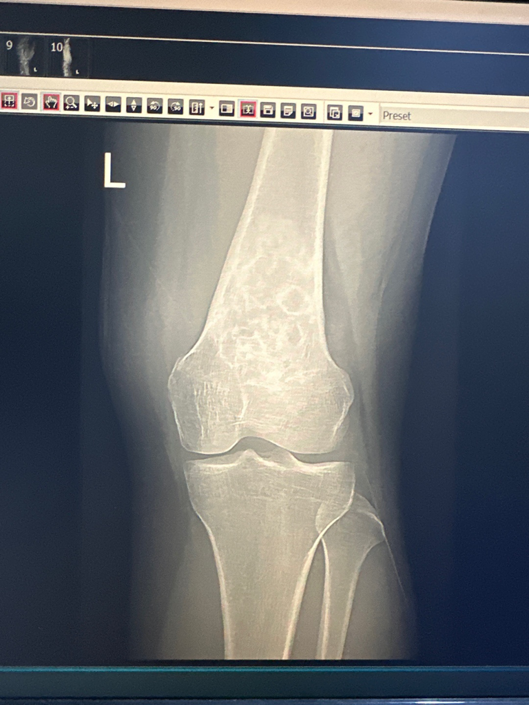 엑스레이 사진만으로는 평가가 제한됩니다. 이상 소견이 있는 것으로 보이는데 그것이 뼈 내부에 종양이 있는 것인지 아니면 다른 문제가 있는 것인지 등 구체적으로 감별이 어렵습니다. MRI 등 정밀 검사를 진행해보는 것이 필요해 보입니다.
