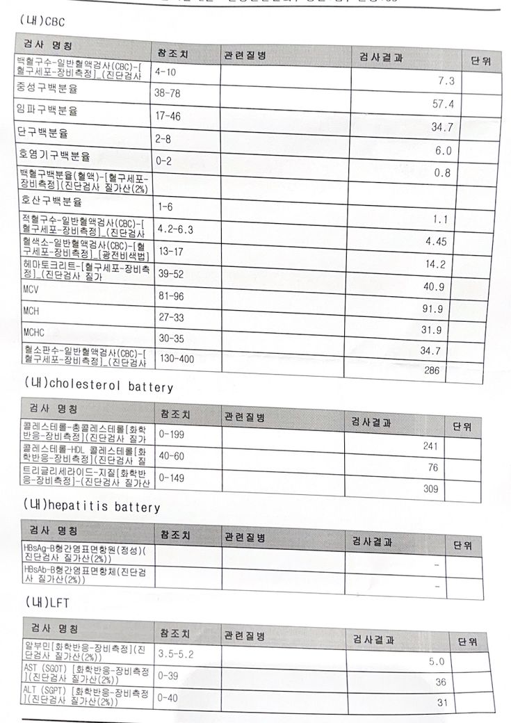 86년 생 남자 신장기능이상, 간기능이상, 중성지방, 콜레스테롤이 높게 나왔습니다.