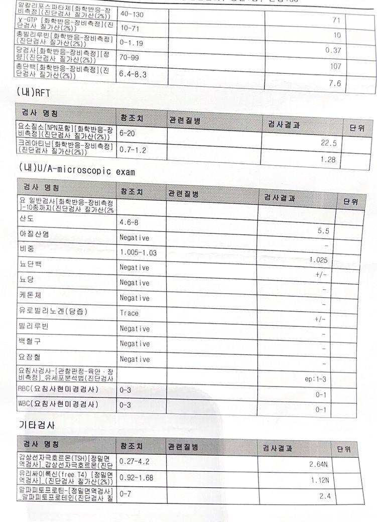 이런게 나와서 일주일 뒤 동네 병원에서 피검사, 소변검사만 다시 받아봤습니다.