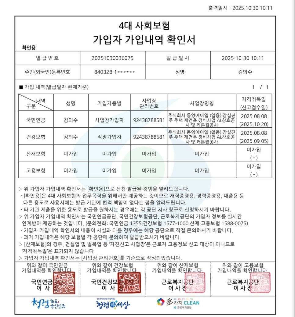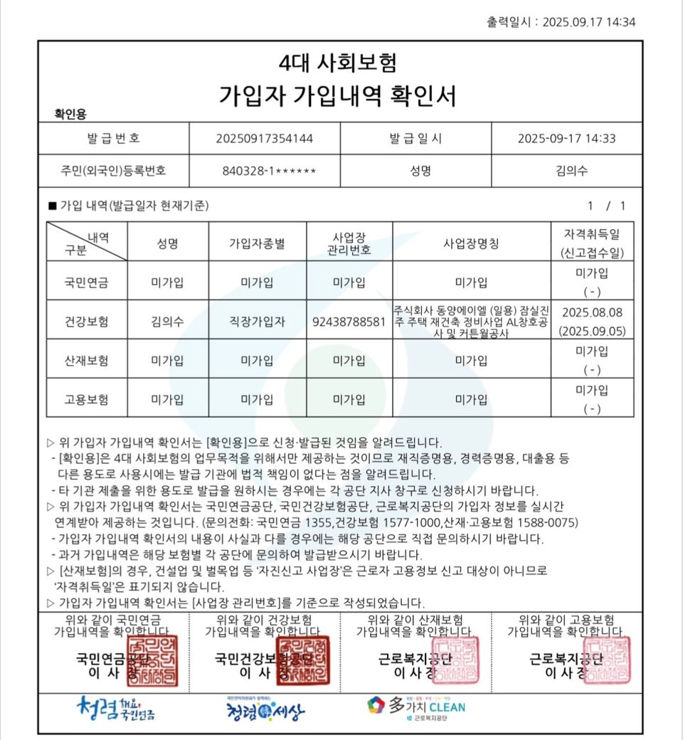 문제는 초반에 확인서에 건강보험만 찍혀 있고 나머지는 미가입으로 확인되었습니다.