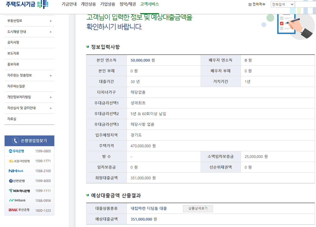 대출 한도를 알아본 결과 3억5천1백만원이 나왔습니다