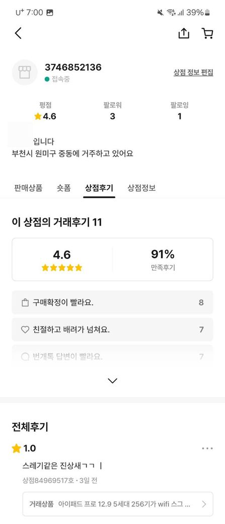 번개장터 물건 구매자로서 판매자가 제 번개장터 후기에 "스레기같은 진상새 ㄱㄱㅣ" 라 적은