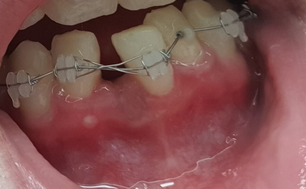 발치한 우측 치은에 염증이 발생한 상태로 보이며 안쪽으로 고름이 찬 것으로 보입니다.