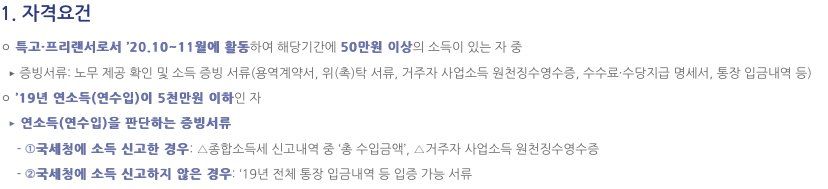 질문하신 내용에 대하여 아래와 같이 답변 드립니다.재난지원금 요건 충족 여부는 세무/회계와는 무관하여 답변이 어려우나, 첨부해주신 사진에는 2020년 10월~11월에 활동한 자에게만 지급되므로 올해 1월부터 활동하셨다면 받기 힘드실 것으로 보입니다.