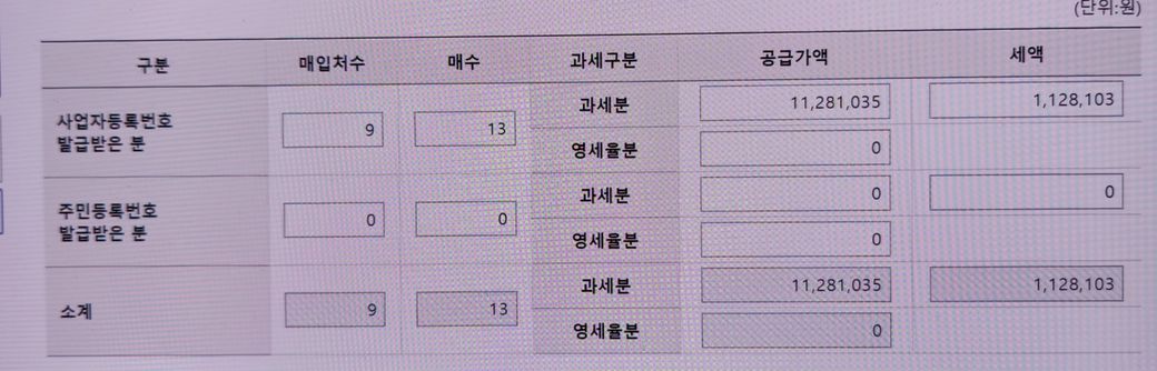 그럼 전체 공급가액에는 11,281,035원 에 534,455원을 제한 10,746,580를 입력하고 전체 세액에는 1,128,103원 에 53,445원을 제한 1,074,658 입력하면 될까요?