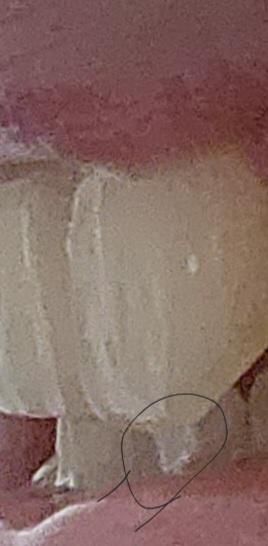 사진이 흐려 명확히 보이지는 않습니다만 일부 작은 크기의 치아조각 깨지는 경우 있을 수 있긴합니다. 작은 파절이라도 계속 깨져나가는 경우 있을 수 있기 때문에 근처 치과 내원하셔서 한번 확인해보시기를 바랍니다.