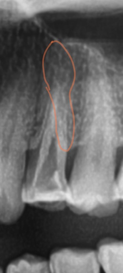 빨간색선으로 표시된부분이 금이나 충치같고 뿌리끝으로 충치나 금이 이어저서 뿌리쪽 뼈까지 녹고 염증 치근병소를 만든거 아닐까싶어요