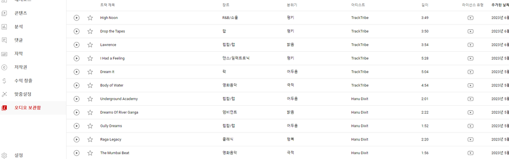 아래는 유튜브 스튜디오 음악보관함 스샷입니다.