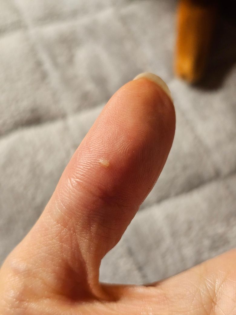 사진에서 보이는 흰색 융기와 주변의 약간의 부종은 작은 농포(pustule) 형태로 보이며, 반려견에 의한 교상(dog bite) 이후 초기 국소 감염 가능성을 의심할 수 있습니다. 개에게 물린 상처는 겉으로 작아 보여도 세균이 깊이 들어가는 경우가 많아 비교적 감염 위험이 높은 편입니다. 특히 손가락은 혈류와 공간 구조 때문에 염증이 빠르게 진행할 수 있는 부위입니다. 원인균으로는 Pasteurella species, Staphylococcus, Streptococcus, Capnocytophaga 등이 흔합니다.