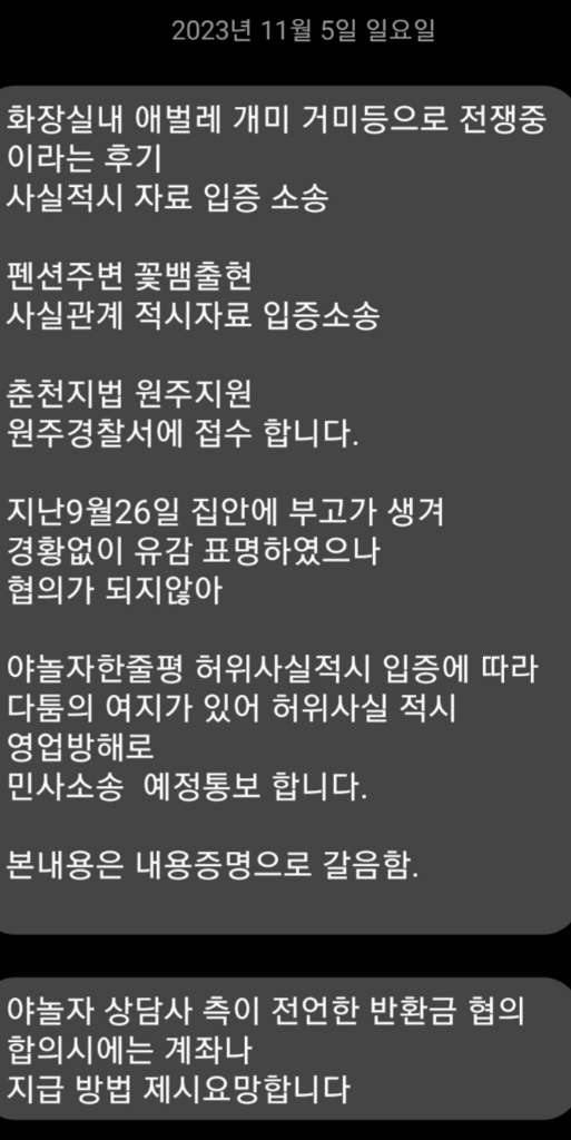 오후에 일어나자마자 삭제하고 문자함을 확인해보니 펜션측에서 내용증명을 보냈습니다. 저는 이게 협박으로 느껴지고 몹시 당황스럽네요.