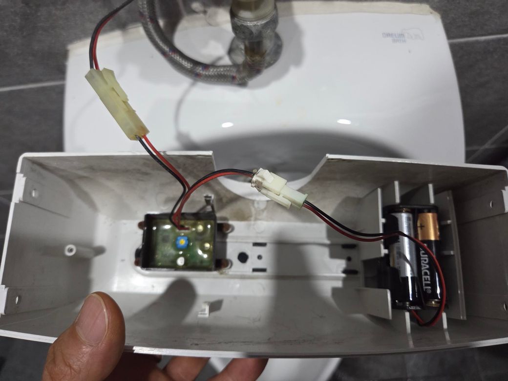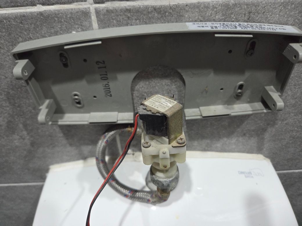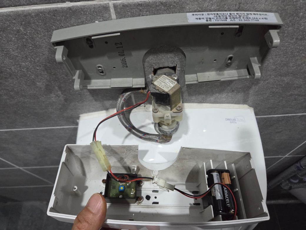 사진상으로 보면 건전지를 교체했는데도 작동하지 않는 경우, 센서부나 솔레노이드 밸브(물 나오는 부분 제어 장치)에 문제가 있을 가능성이 높습니다.