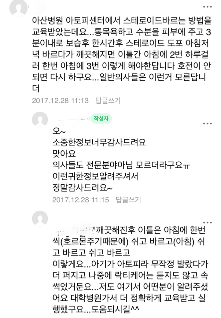 이분 말대로 보습제 바르고 한시간후에 스테 로션 퍼바르니 뭔가 피부장벽이 같이 튼튼해지면서 낫는 느낌이 좋습니다