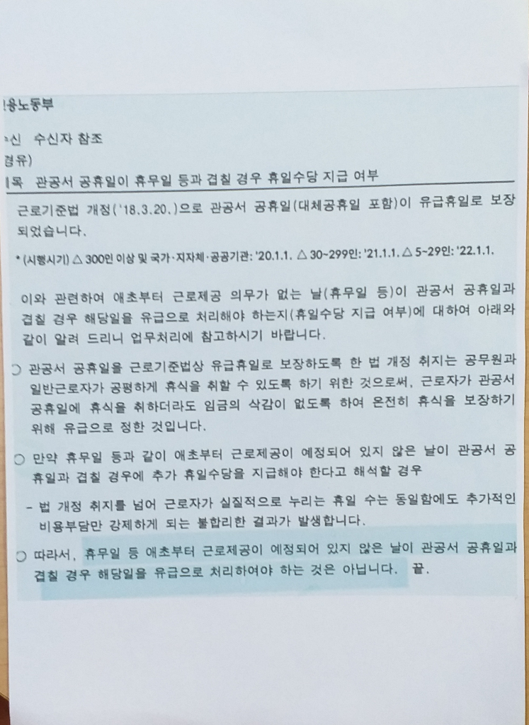 일을 하지 않는 경우라면 유급으로 보장할 필요는 없지만 일을 하였다면 5인이상 사업장의 경우 휴일근로에 대한 가산수당