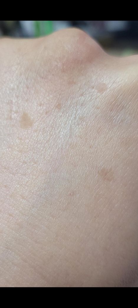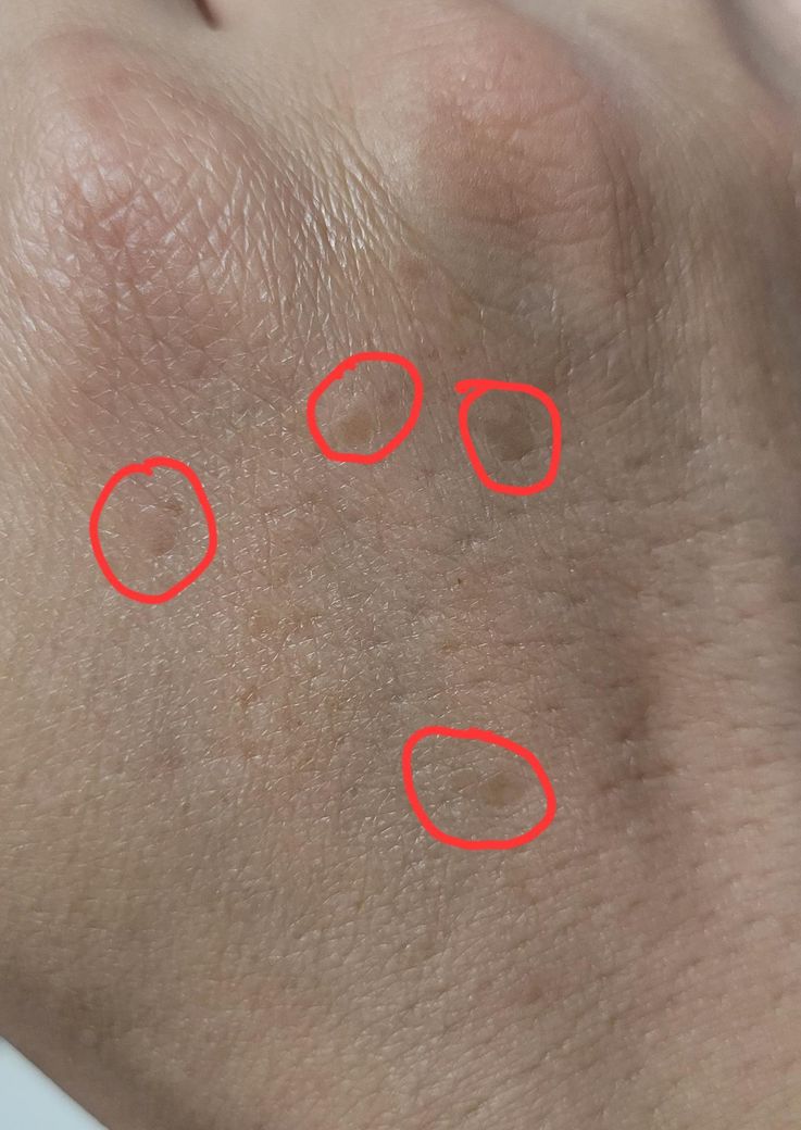 사진 확인했습니다. 말씀하신 대로 손등에 여러 개의 납작하고 약간 갈색빛을 띠는 작은 병변들이 보입니다.
