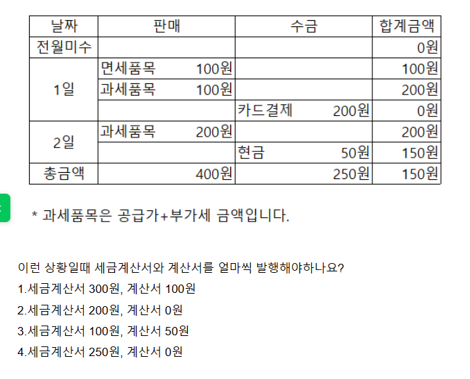 한편 부가가치세 면세 품목은 1일에 100원 판매되었음으로 계산서를 발행