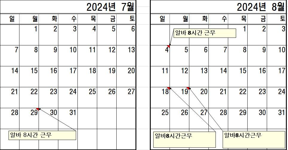 예를들어 7월29일이랑 8월4일근무총근무시간 16시간이믄 한주라 주휴발생이맞고 8월18일이랑19일동일한 16시간이라도 저렇게되면 주휴발생은안돼는건가요? 딱 저렇게 이틀 하루8시간근무시 주휴발생 알려주세요