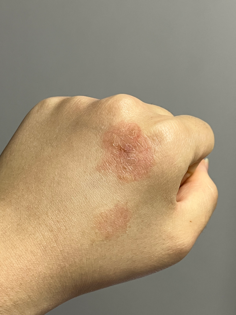 화폐상 습진이나 피부사상균 감영이 생각되는데요