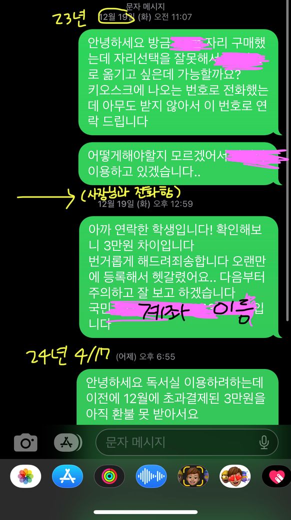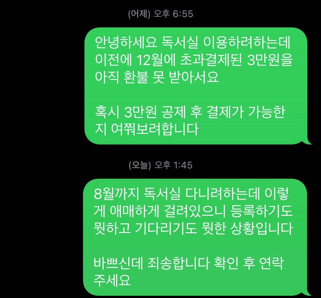 23년에 제 실수로 독서실 자리착오를 하여 키오스크에서 3만원 상당의 금액을 초과결제 하였고, 총무가 있지않아 사장님께 유선상으로 이를 알려 환불받기로 했습니다