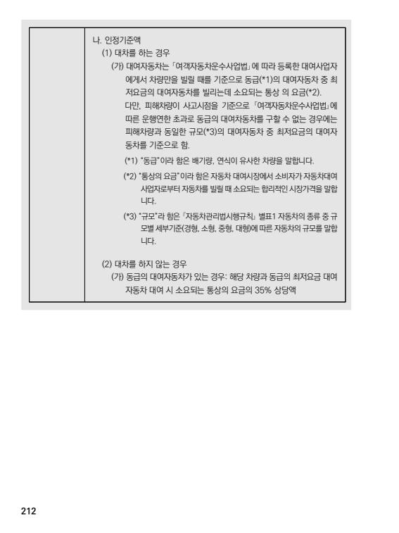 차종에 따라 렌트비가 다르므로 교통비도 달라지며, 수리기간 동안 1일 단가 × 수리일수로 산정됩니다.