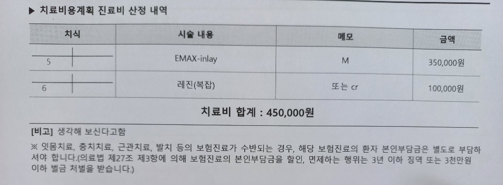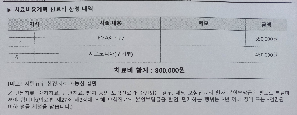 전부다 비보험 진료이기 떄문에 치과마다 차이는 잇습니다. 평균적인 가격인거 같습니다. 치식은 가운데를 중심으로 4분악으로 나눠서 1-7번까지 표시를 하니 사진에서 보이는 5.6번은 우측 하악 5번 6번 치아를 말하는겁니다.